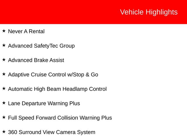 - Advanced SafetyTec Group: Adaptive Cruise Control, 360 Surround View Camera, Advanced Brake Assist, Automatic High Beam Headlamps, Parallel & Perpendicular Park Assist, and more