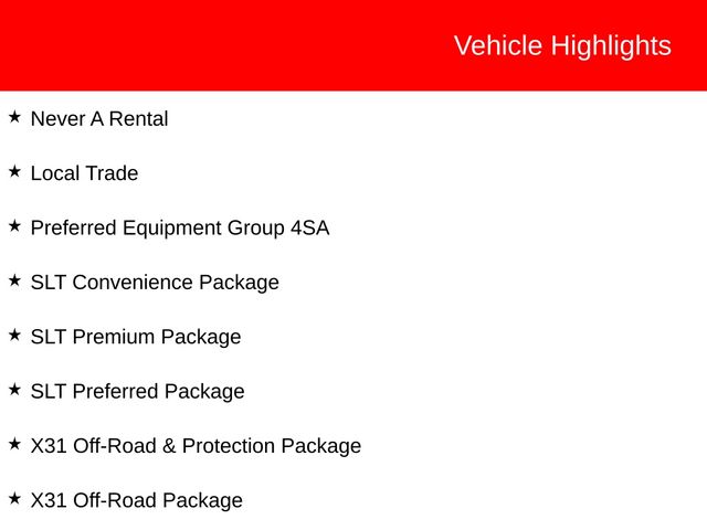 • The SLT PREMIUM PACKAGE, SLT PREFERRED PACKAGE, and X31 OFF-ROAD & PROTECTION PACKAGE elevate this Sierra 1500 to new heights, offering a wealth of premium features and capabilities.